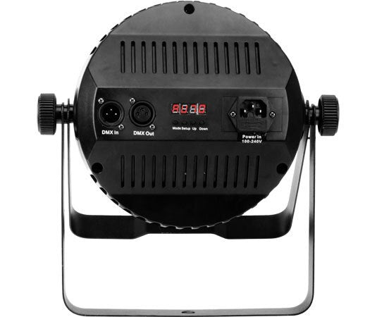 My Par 56 features high-power color mixing with 50 red, green and blue LEDs. The unit also responds to 5 channels of DMX control. It produces a bright, narrow beam that cuts through fog and is ideal when a concentrated light is needed. The hanging bracket doubles as a floor stand for mounting versatility.