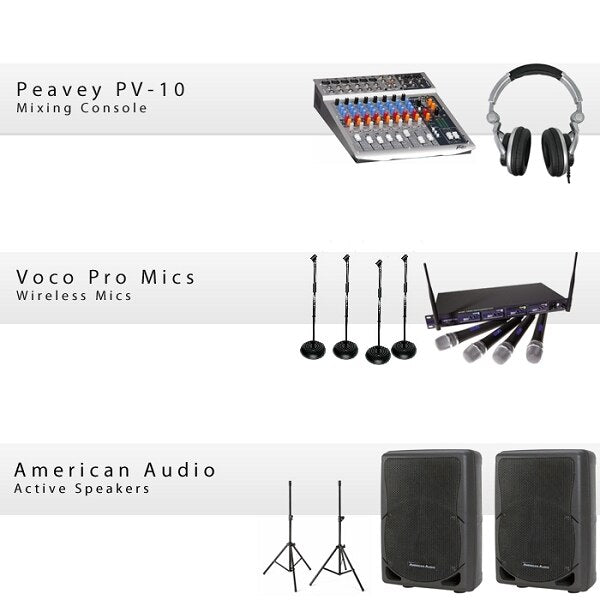 One Peavey PV 10 One Voco Pro UHF 5800Two Active SpeakersFour Mic StandsTwo Speaker StandsOne HeadphoneFree Cables