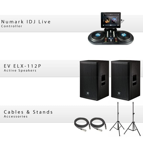 One Numark iDj LiveTwo Electro Voice ELX112pTwo CablesTwo Speaker Stands
