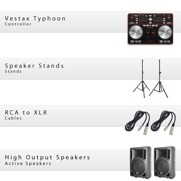 One Vestax TyphoonTwo Speaker StandsTwo CablesTwo Powered Speakers