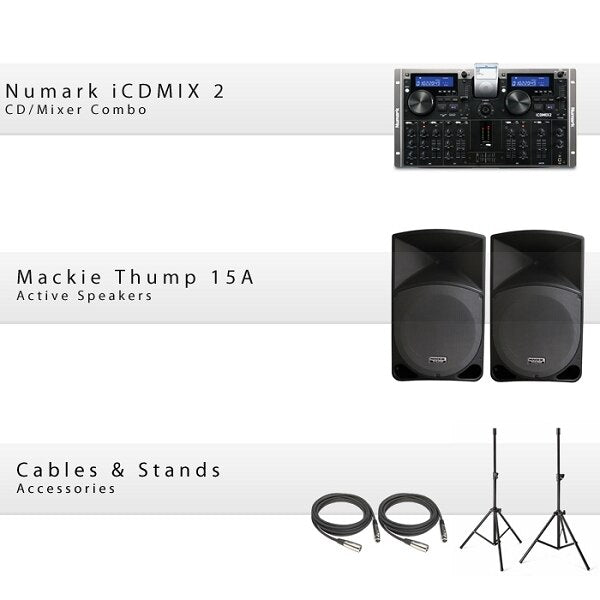 One Numark iCDMIX2Two Mackie Thump 15ATwo CablesTwo Speaker Stands