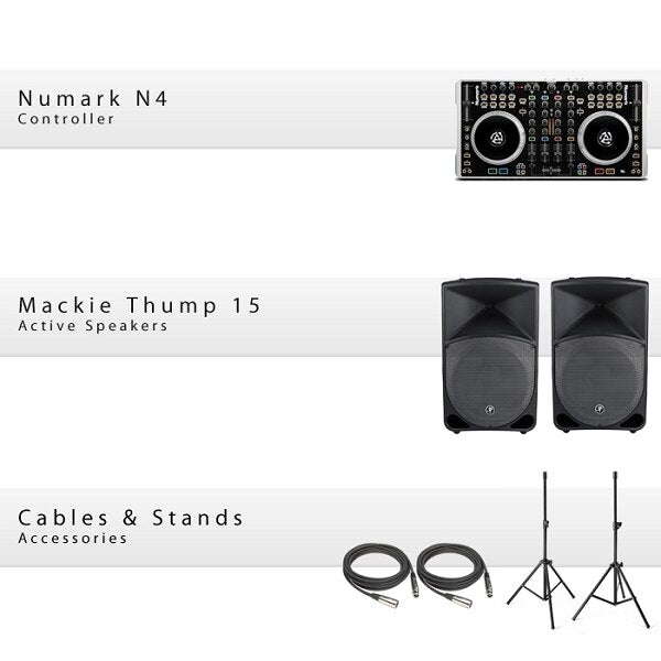 One Numark N4Two Mackie Thump 15Two CablesTwo Speaker Stands