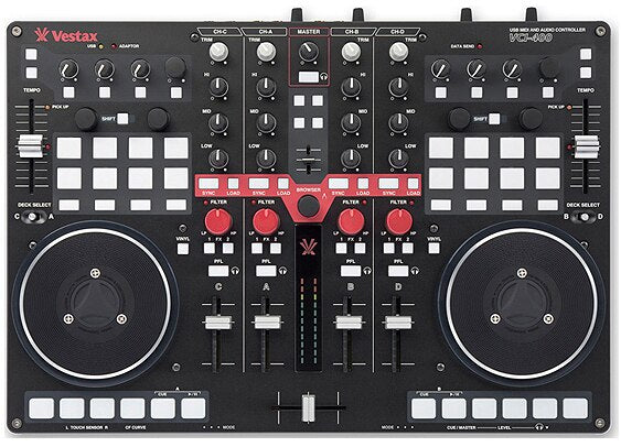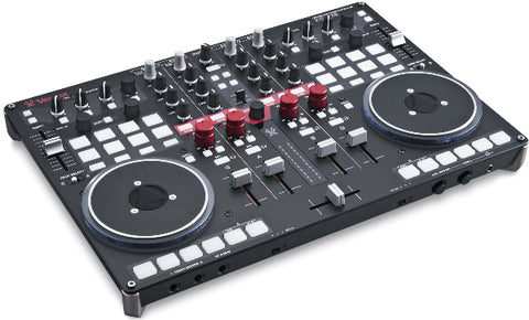 The Vestax VCI-400 Professional MIDI & Audio Controller delivers a host of features and 4-deck MIDI control over virtually any DJ software for the Mac & Windows OS. In addition, the VCI-400 is a professional USB soundcard, boasting 24-Bit / 48kHz audio resolution, XLR and 1/4" phone master outputs, a pair of Combo-XLR & 1/4" phone microphone inputs, headphone output, and two RCA line inputs for connecting CD decks, digital decks and more.