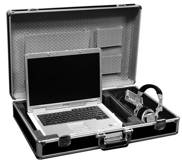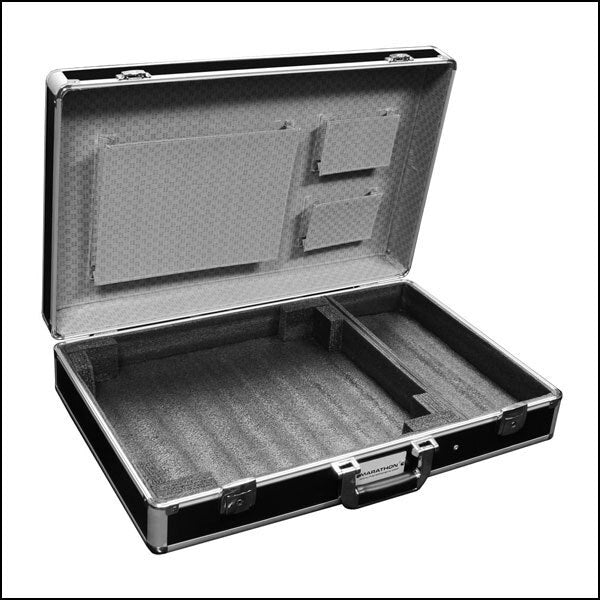 The Marathon MA-ELTS eLIGHT Euro Style Laptop Case with Side Storage (Black) is made to carry and protect a laptop with a screen up to 17". The case is made from lightweight steel laminated to plywood with diced foam on the bottom and convoluted foam in the lid. There is a side storage section that can hold accessories like microphones, headphones and small USB devices. It has two latches with key locks and a folding carry handle.